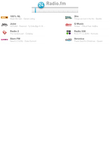 In deze app kan je luisteren naar alle bekende stations (Nederland FM) zoals: Radio 538, 3FM (serious request), Radio 2 (top 2000), Slam FM, Veronica, Qmusic en 100% NL.