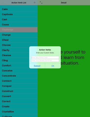 Add your own words and sample sentences. You could also add a definition if you choose, instead. You can also delete your added action verbs (or any of the 277 pre-loaded verbs) if you want by swiping left on the word and then pressing “Delete”.