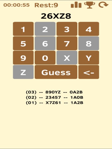 Traditional guessing game, this time you need to guess from 13 characters (0,1,2,3,4,5,6,7,8,9, X, Y, Z) are not repeated 5 characters come.