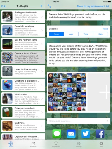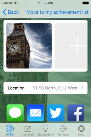 In addition to your to-do-list you can list your lifetime achievements and build up a history of your lifes successes and accomplishments. Things to do before you die - how many have you achieved? Share your goals and achievements directly from this App with your friends via email, message, twitter or facebook.