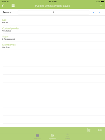add recipes and import your ingredients into your shopping list. Let the app calculate the amount of ingredients for the particular number of portions you want to cook.