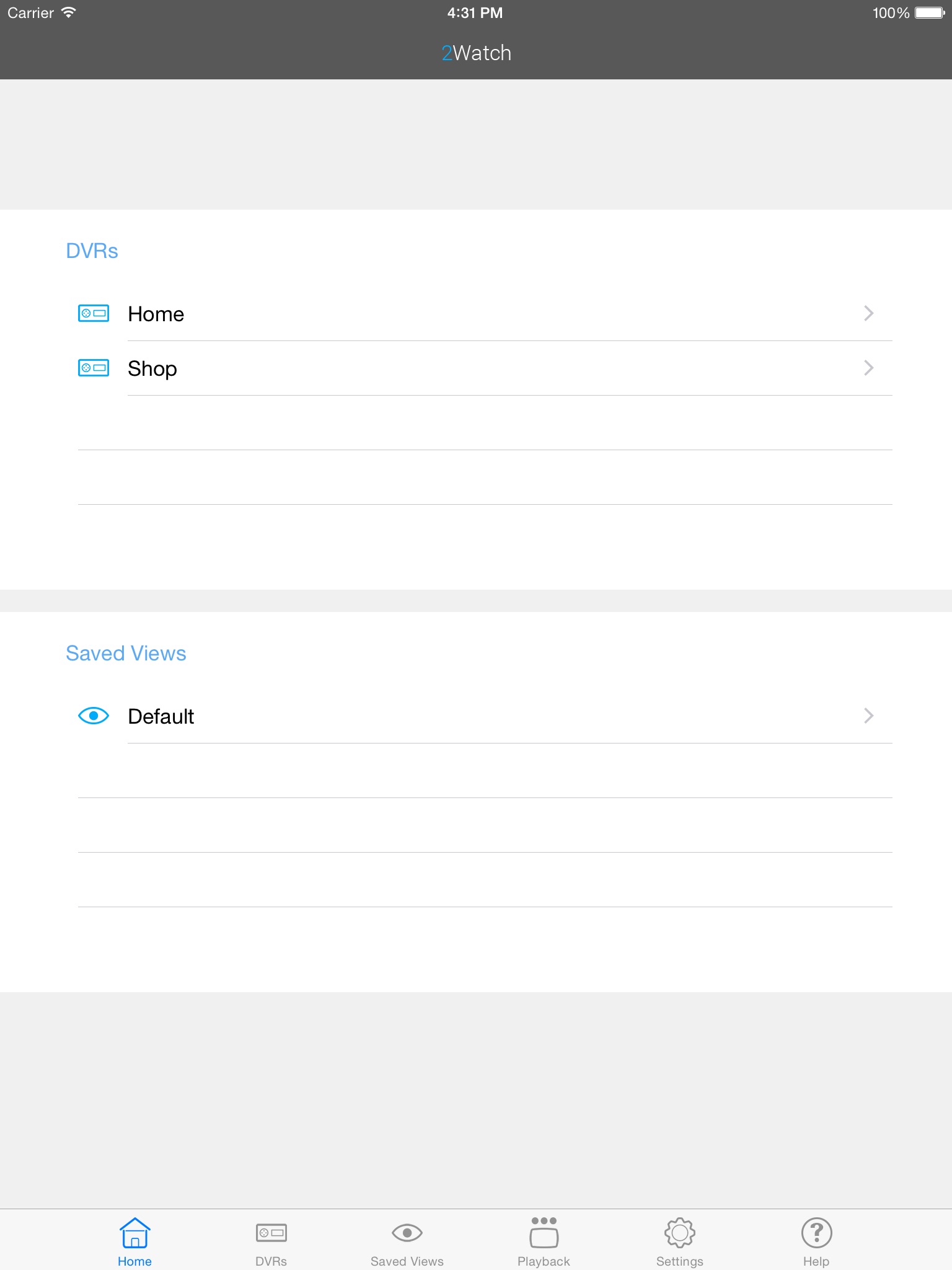 2Watch can connect to multiple devices and organize different screens that display video from different devices, can also view recorded video locally or remotely on the devices.
