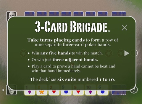 Form a line of 3-card poker hands placed one card at a time against your opponent. Dominate the field, or win just three adjacent hands to break through and win the battle!