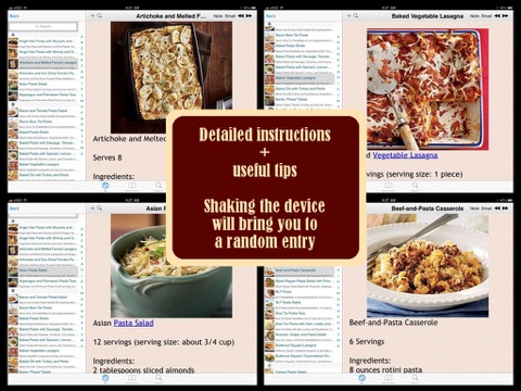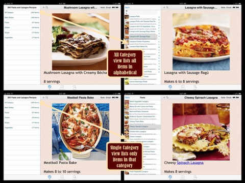 300 Pasta and Lasagna Recipes is an application containing over 300 recipes of Pasta and Lasagna. The recipes are grouped into different categories for easier reference. For each recipe included in this App, a photo, an ingredient list, a detailed nutritional info and a step by step cooking direction is provided. This App is an excellent app for anyone who wishes to make their own pasta/lasagna at home.