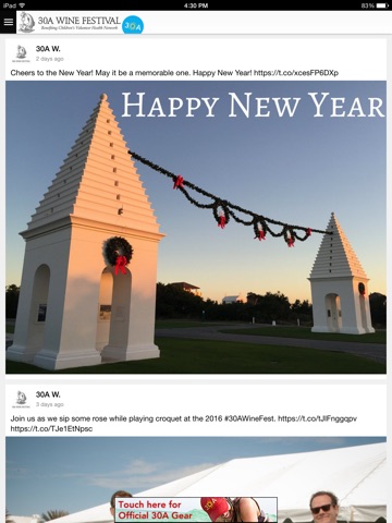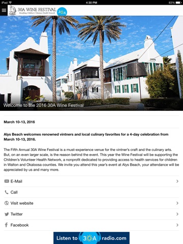 30A.com presents the ultimate guide to the 5th Annual 30A Wine Festival in Alys Beach. This event is a must-experience venue for the vintner’s craft and the culinary arts. This year, the 30A Wine Festival will support the Children’s Volunteer Health Network, a non-profit dedicated to providing access to health services for children in Walton and Okaloosa counties. For more information, visit www.30Awinefestival.com.