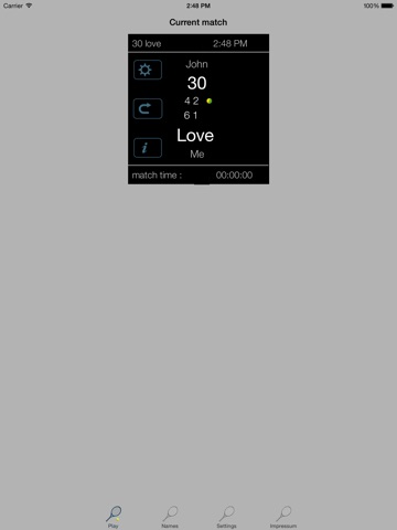 There is a players-database configurable on the iPhone/iPad that lets the user choose new tennis-adversaries. Once several adversaries are defined, the app allows for simple switch between these adversary-players. All match-settings (including match-time and statistics etc.) are stored prior to the switching. The user can easily go back to another player and continue the match with that person. Therefore the app allows for multi games.