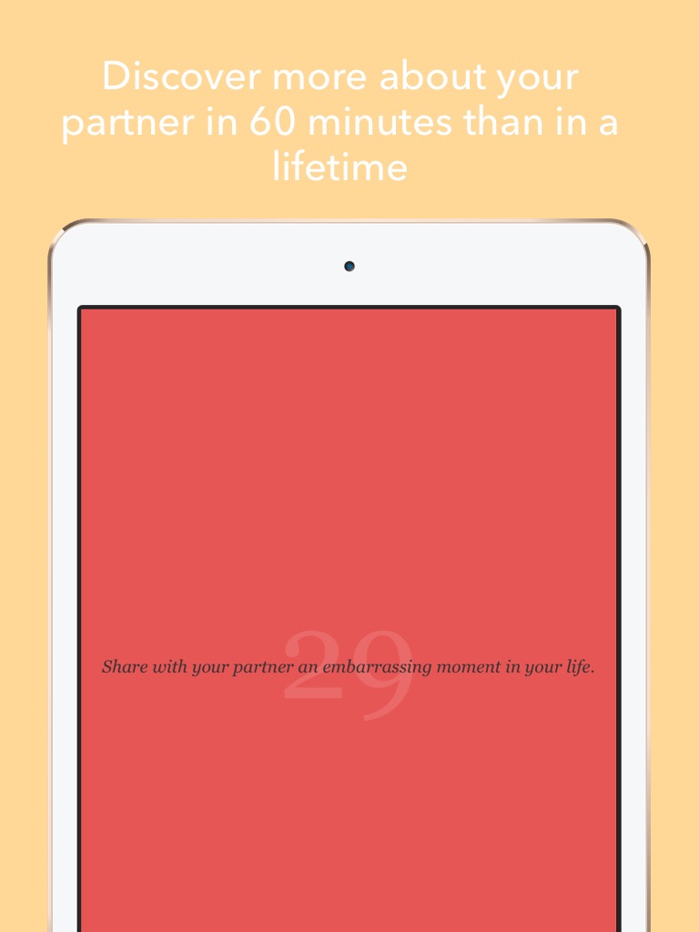 Now you can take on this experiment at home! To play the quiz with your partner (or crush!), you really dont need anything more than this app. Sit opposite your partner with your device between you. Take turns reading one question aloud to each other, then both of you answer. Simple, but exciting!