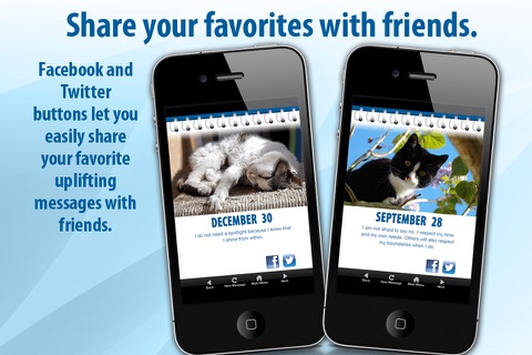 A perpetual calendar with daily affirmations and beautiful cat imagery. Every day has a new picture and positive affirmation. Share your favorites with friends.