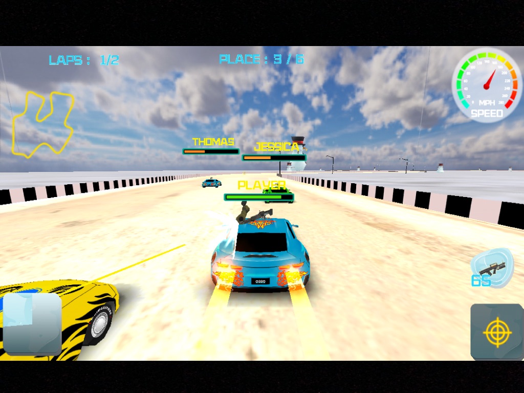 Super fast action! Race other cars, shoot them and collect cool power ups to defeat them. Game only on Apple Devices.