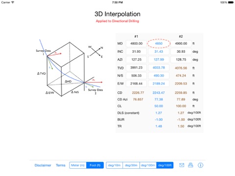 The 3D Interpolation provides an useful tool to calculate projections TVD (True Vertical Depth), N/S and E/W coordinates, Horizontal Displacement, Dog-Leg Severity, Build-Up Rate (Angle Rate, Intensity) and Turn Rate and also the Interpolation of these parameters between two well planning sections or survey stations defined by Measured Depth, Inclination and Azimuth as entry parameters in the directional drilling of oil wells.