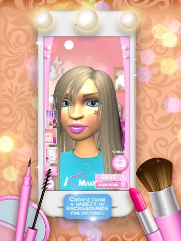 * Take pictures of your creative makeup looks and share them with your friends on Facebook, Twitter or save them to your personal gallery.