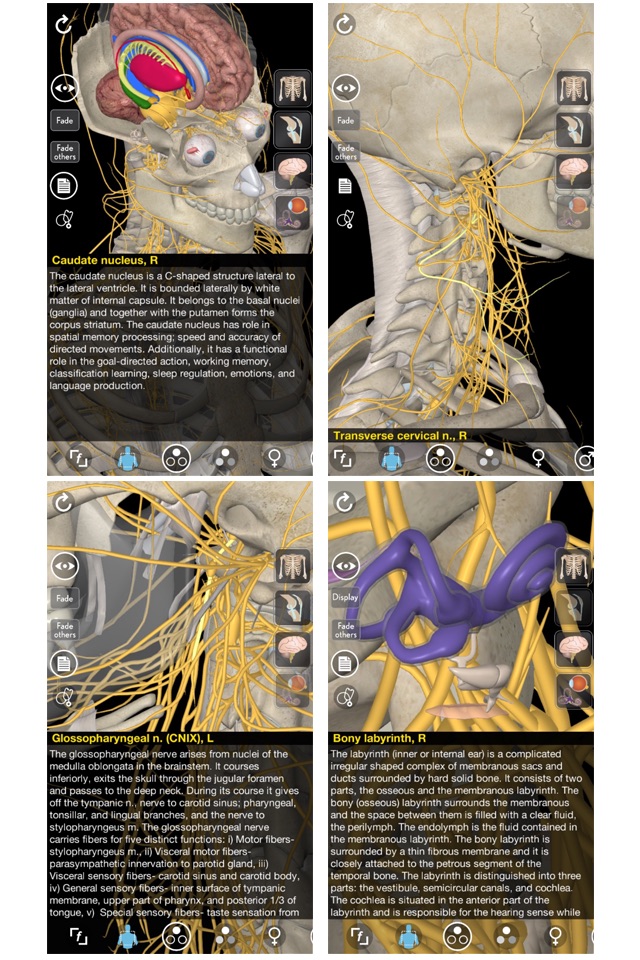 Learn neuroanatomy with thousands of realistic anatomical models/structures. An all-in-one solution for learning clinical, topographic and systems-based anatomy. The 3D anatomy models can add important cognitive input for understanding the spatial relationship between anatomical structures and landmarks leading to an increased retention of knowledge. The app includes skeletal system and connective tissues as a bonus.