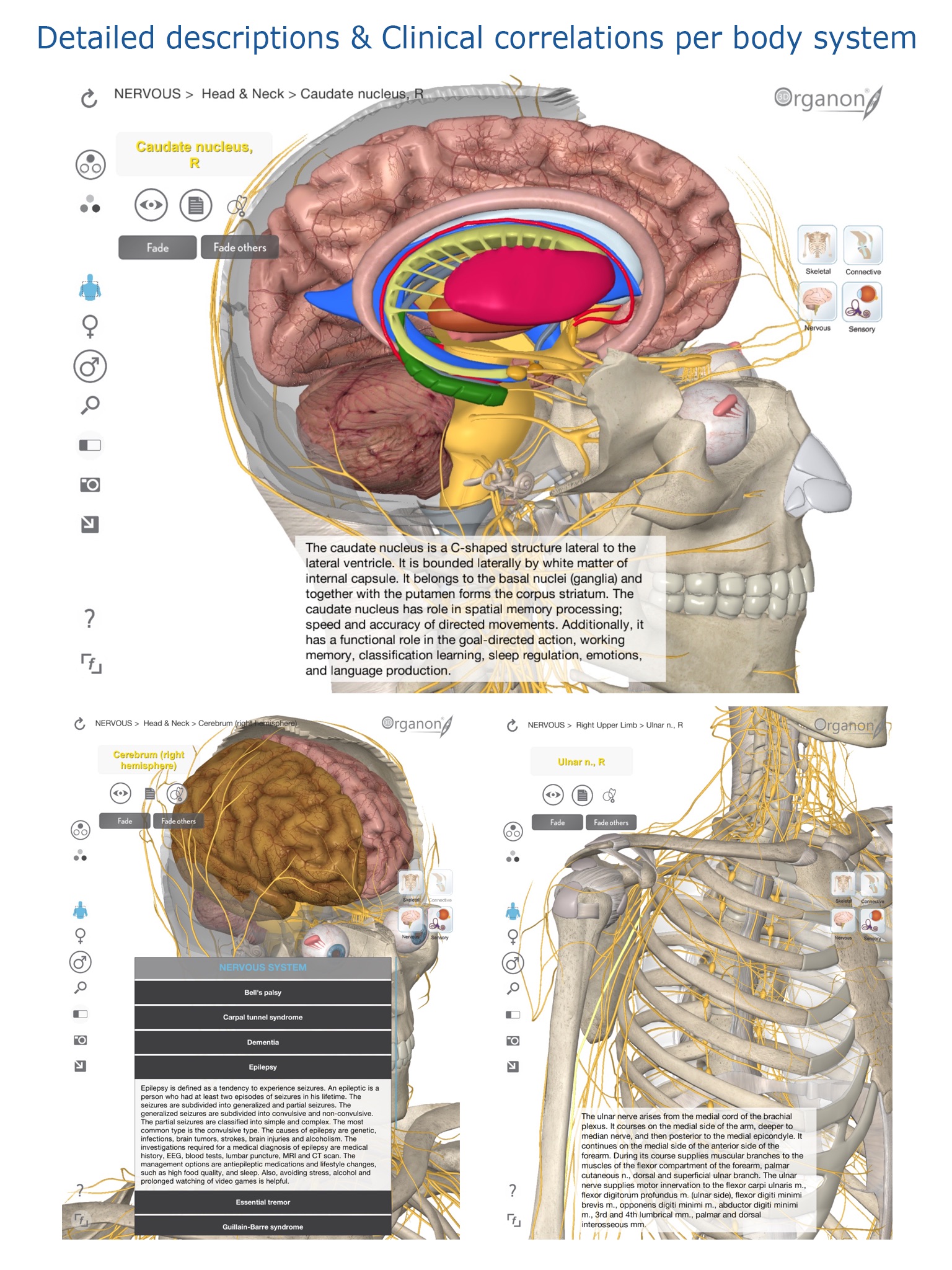 3D Organon Anatomy – Brain and Nervous System is a feature-rich interactive neuroanatomy atlas enhanced with quality anatomy descriptions and texts with frequently encountered clinical correlations.
