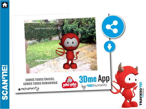 Teniendo al peluche contigo, 3dme app te permite escanear al peluche y automaticamente lo reconocerá, mostrandote al mismo en pantalla. Se te habilitarán herramientas para que puedas escalar tu 3dme!, rotarlo 360 grados y posicionarlo como tú quieras. No solamente podrás componer fotos en el mismo momento con el 3dme! sino que además podrás importar cualquier foto de la galería de imágenes de tu celular y crear composiciones muy divertidas con él.