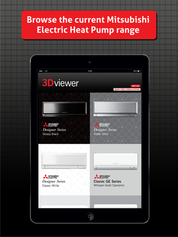 3Dviewer works with the power of augmented reality to create a live 3D preview of any of the current Mitsubishi Electric High Wall and Floor Console Heat Pump range, right in your own home! 3Dviewer uses your smartphone’s camera, accelerometer, and compass to create the 3D heat pump - giving you the perfect tool to plan the placement, type, and colour of your future heat pump.
