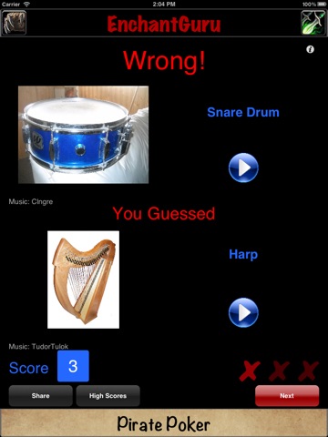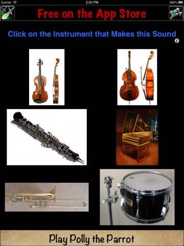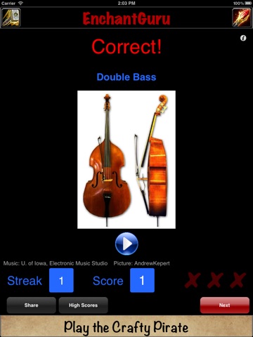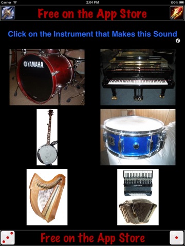 Identify the correct photo of an instrument when hearing the sound that it makes. Get as many correct as you can but three-strikes and the game is over.