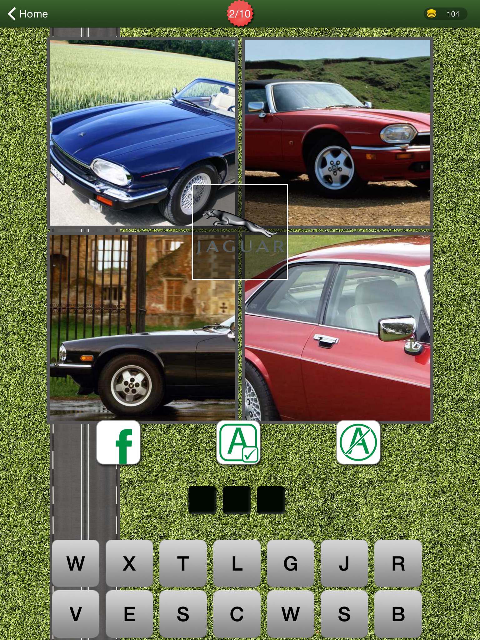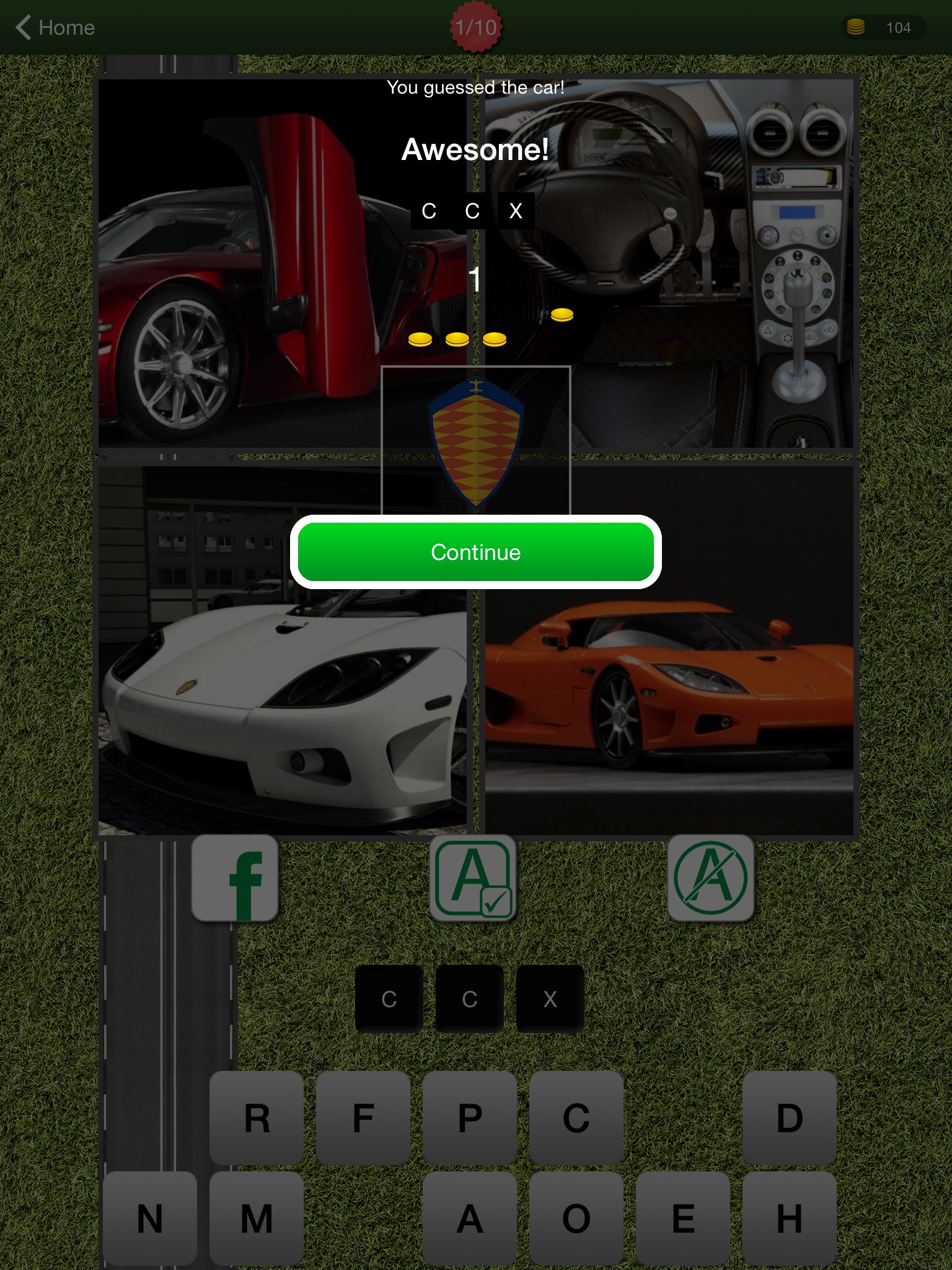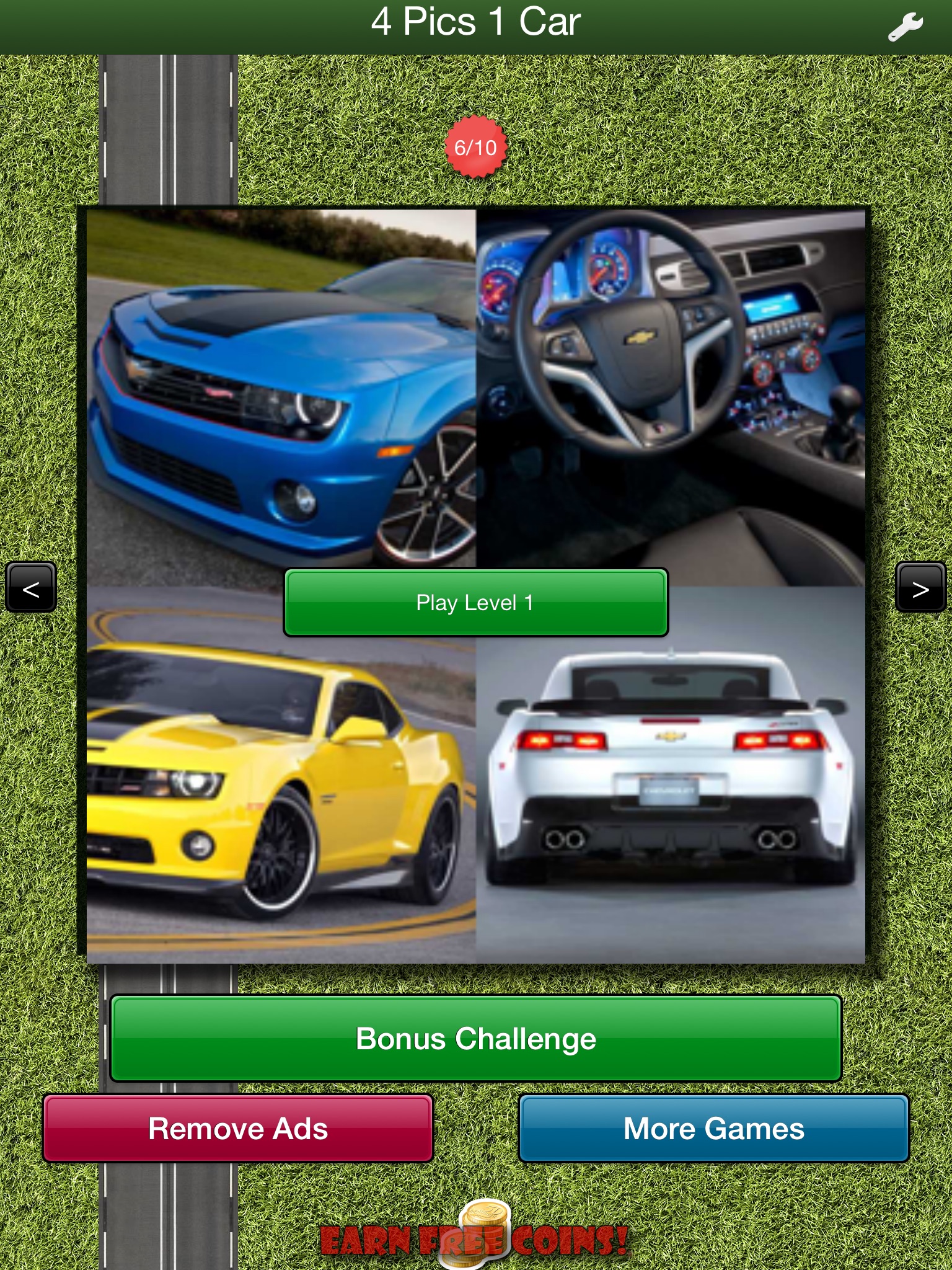 Guess 10 Cars correctly to unlock the next level. There are 12 levels to choose from, with a bonus Car every 8 hours. Thats a total of 144 cars - some super, some not so super :)