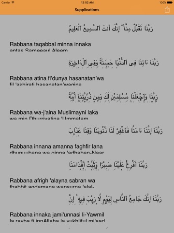 Each rabbana is displayed in Arabic with its translation (in several languages) and transcription.