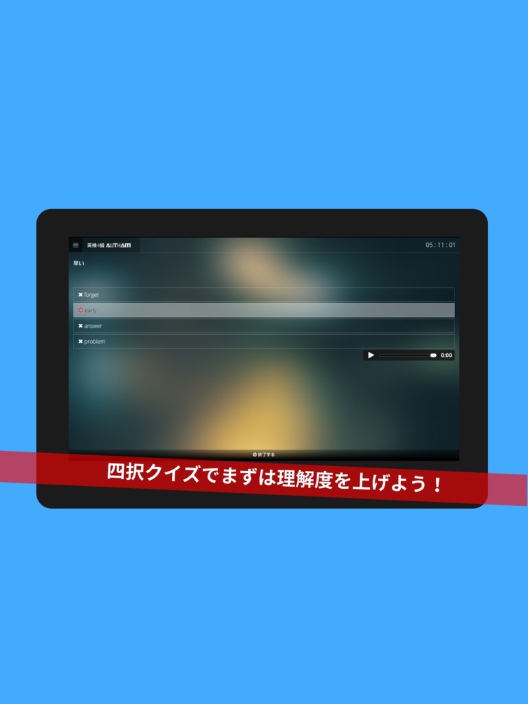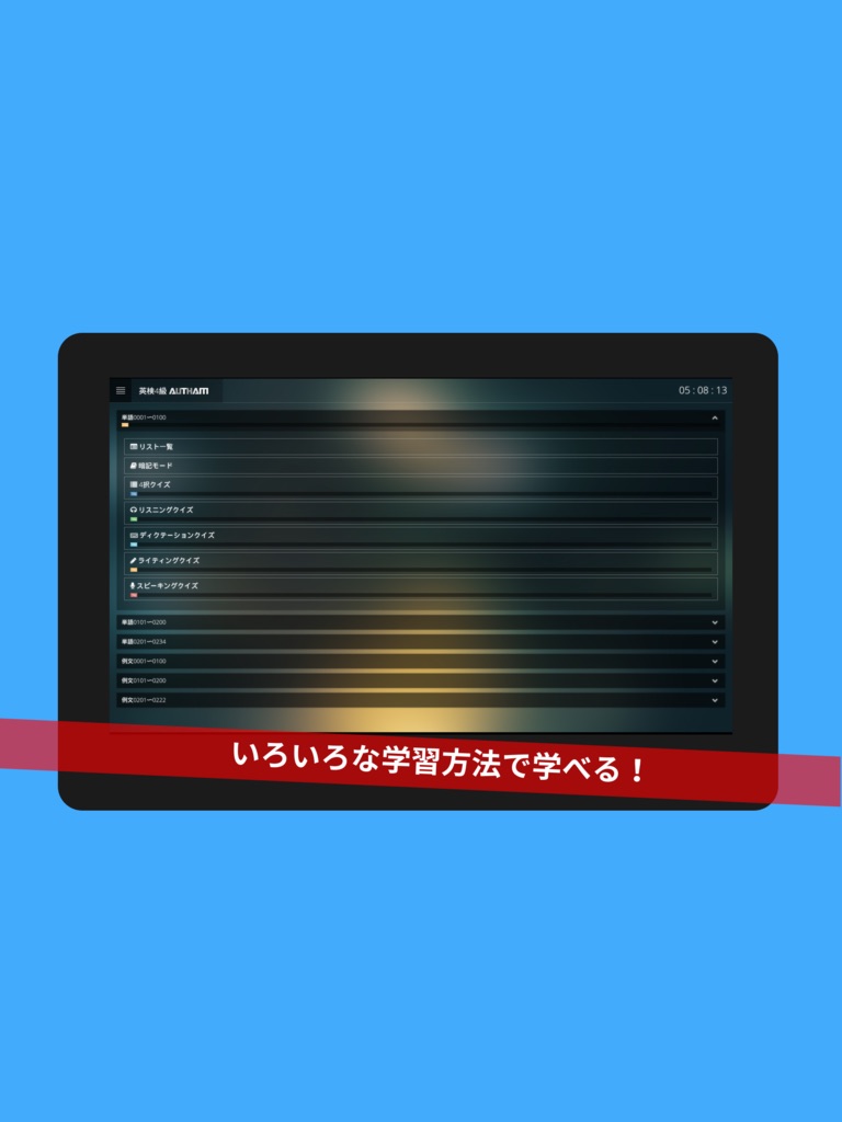 「暗記モード」「四択クイズ」「リスニングクイズ」「ディクテーションクイズ」「ライティングクイズ」「スピーキングクイズ」の計六種類の方法で学習ができて、それぞれに「理解度」が記録されるため、効率よく学習が可能です。