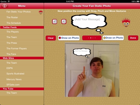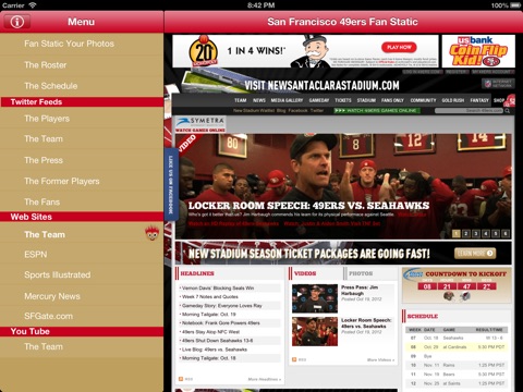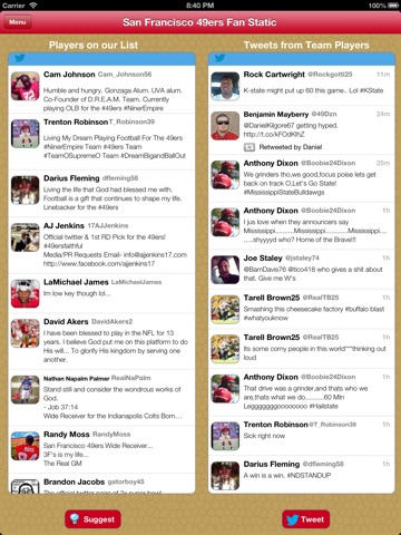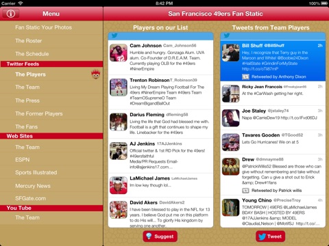 San Francisco 49ers Fan-Static keeps you up to date and allows you to get involved and show off your true fan spirit! Follow Twitter Feeds from the Current Players, Management, Local Beat Writers, Former Players and FANS like you! Youll never miss a news items, fact or tweet with Fan Static.