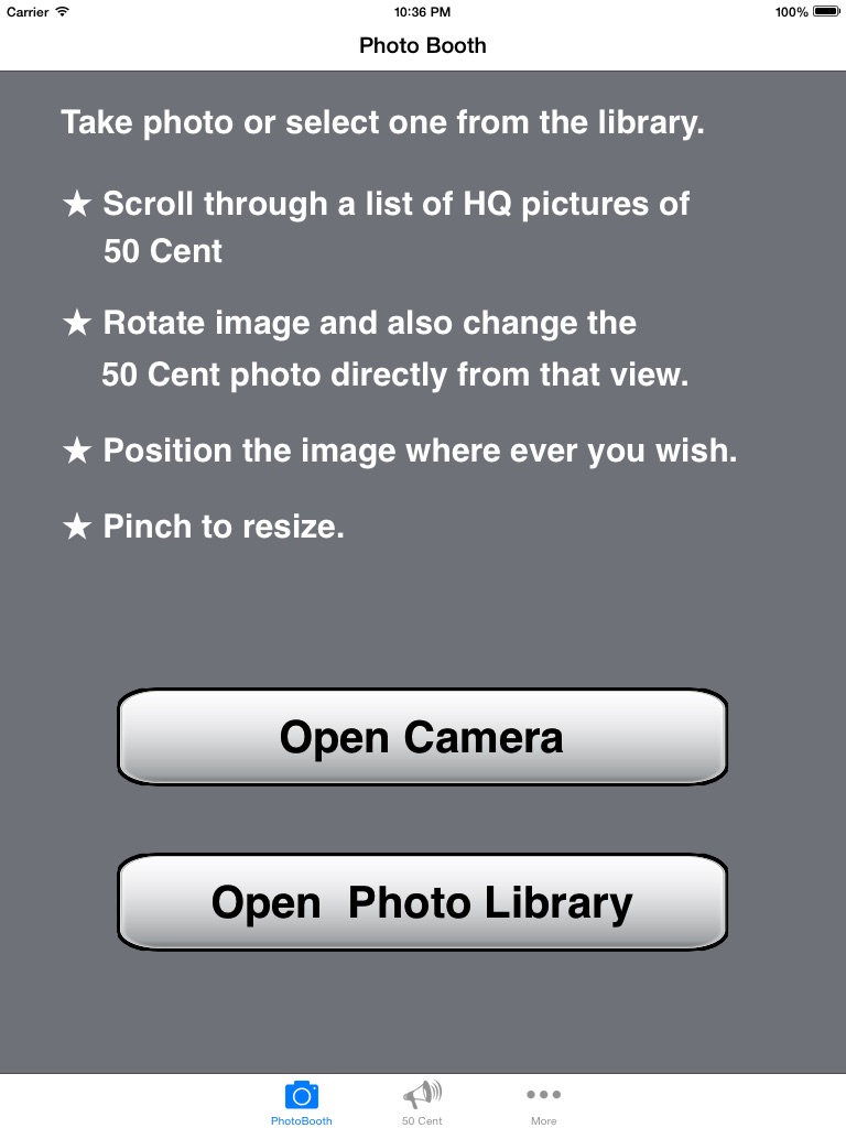 The ultimate 50 Cent Application!! Step inside and choose from various images of 50 Cent to make them your own! Trick your family and friends with this awesome app. Now you can tell everyone youve actually met 50 Cent!