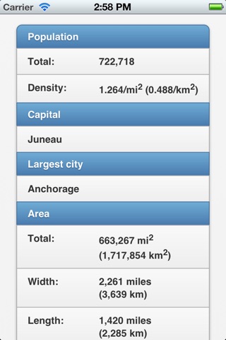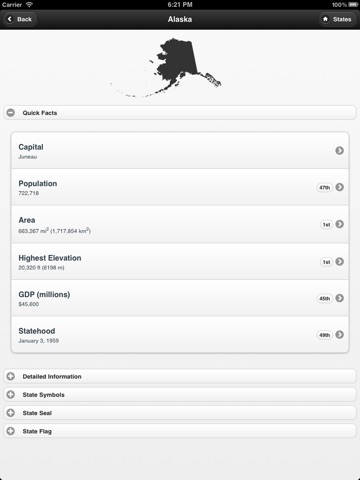 Learn about all 50 states! This application provides the capitals, population, area, GDP, elevation, and symbols of every state in the US.