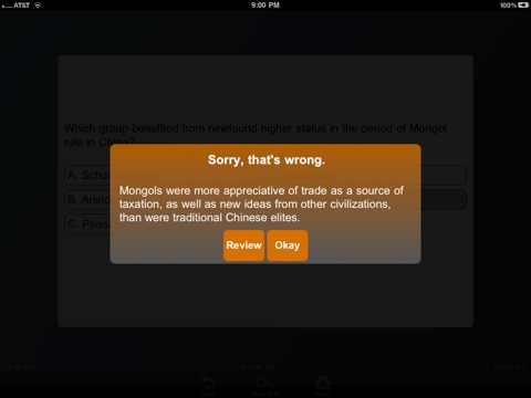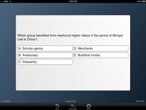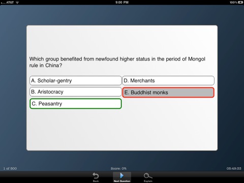 The questions and corresponding explanations are organized according to 5 major time periods, beginning in 8000 bce and ending in the present day. Feeling confident about your test readiness? Then take a practice test where you select the number of random questions included, from 25 to 500. Need more review of, say, the Postclassical Era or the Modern Era? Then select these categories for intensive review. Dont want the questions scrambled each time you take the test? This app allows you to turn off this feature in the settings menu.