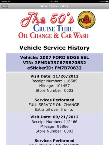 The eSticker app also lets you view a history of all services performed on your vehicles by The 50S Cruise Thru-Pennzoil at any time, so youll always know which services have been performed on each of your vehicles, and when they were last performed.