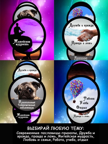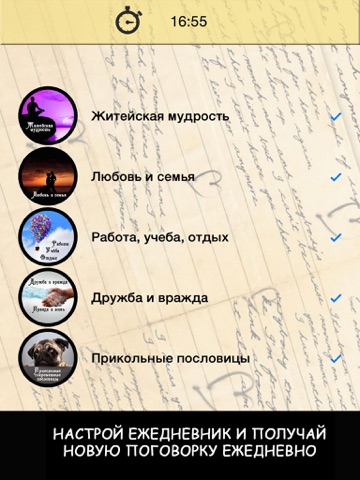 - настроить ежедневник и получать новые пословицы в нужное время и только по интересующим вас темам.