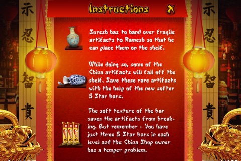 The soft texture of the bar saves the artifacts from breaking. But remember - You have just three 5 Star bars in each level and the China Shop owner has a temper problem