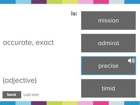 • Just like a set of flash cards, any word a student gets wrong on one of the practice quizzes is returned to the "back of the deck" and will be asked again to make sure the student can answer every word in that section correctly