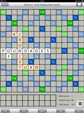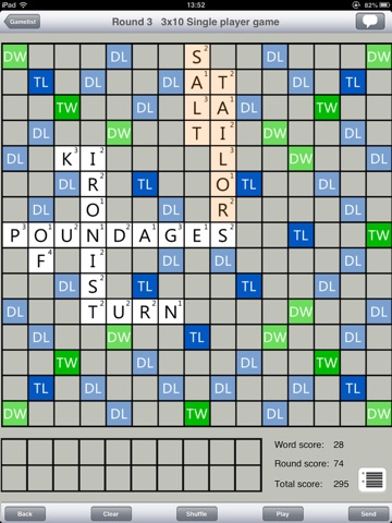In the MINI versions words are made from the letters without c, q, y and x and with a nice distribution of vowels and consonants. The art is then of course to make not only words, but also to place them on the spaces that have more points value to get the highest possible score.