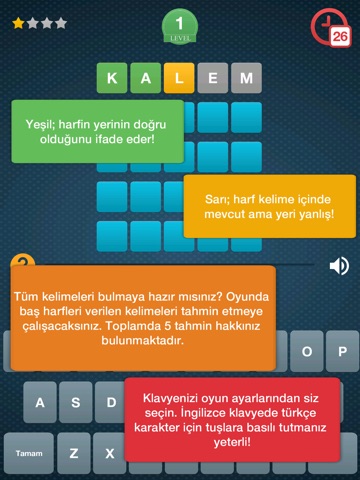 Baş harfleri verilen kelimeleri, size verilen süre içinde tahmin etmeye çalışacaksınız. Harfin yeri doğru ise yeşil, harf kelime içinde bulunuyor fakat yeri yanlış ise sarı yanacaktır. Toplamda 5 tahmin hakkınız bulunmaktadır.