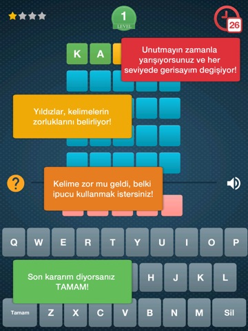 Kelimeleri bulmak için acele edin, kısa sürede bitirmek çok önemli, ne kadar çabuk bulmak o kadar çok puan. Kelimeler farklı yıldızlardan oluşuyorlar, seviyeler arttıkça kelime yıldızları artıyor ve kelimeler de zorlaşıyor. Unutmayın, ne kadar yıldızı yüksek kelime o kadar fazla puan!
