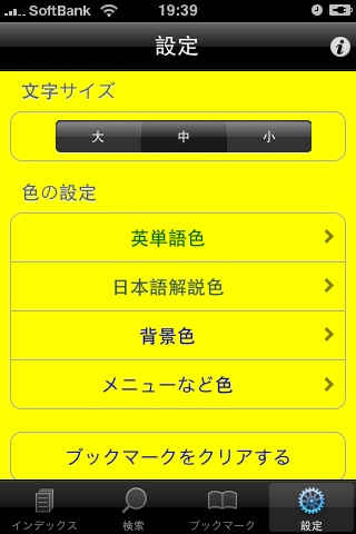 文字サイズ(大、中、小)、英単語文字色、解説文字色、背景色の変更:毎度変更すると、全く新しい勉強環境みたいですので、