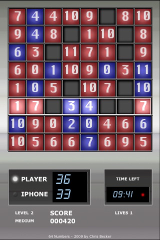 The number 0-11 are distributed on a game board with 64 fields. You choose horizontally, the iPhone (your opponent) chooses vertically. Blue numbers increase your score, red numbers decrease it. The game finishes when no more fields are available.