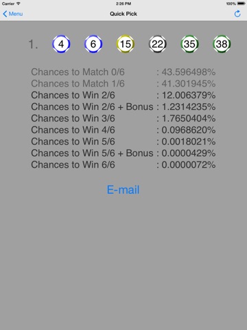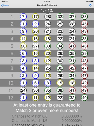 This App is based on sophisticated equations to provide you with just more than 3 hundred combination entries (standard edition only), at least one entry is guaranteed to win at least 3 numbers; 43 entries win at least 2 numbers; 8 entries match at least 1 number and therefore your chances of winning the lottery prizes are significantly increased.