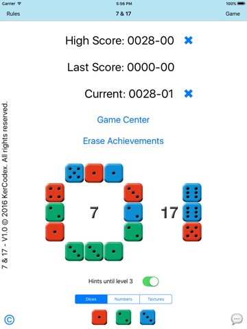 Falling dice are filling the screen. Your mission is to clear them out by aligning three dice that add-up to 7 or 17. If they are of the same color, youll get a bonus!