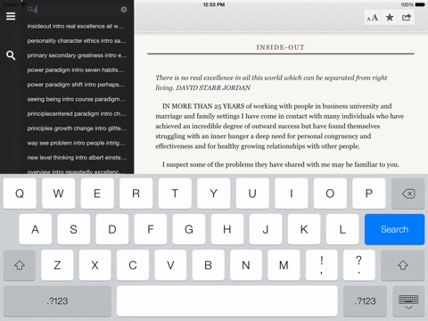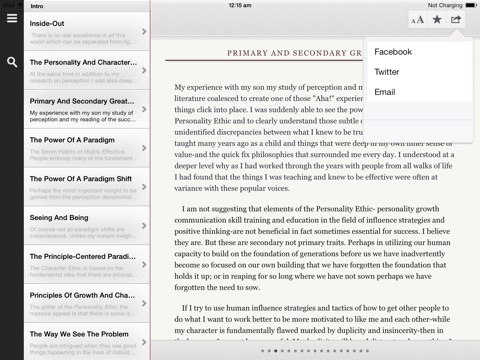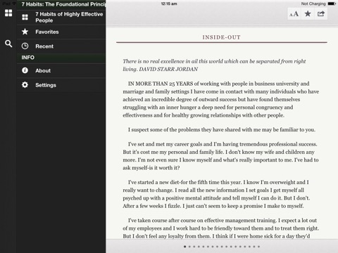 I have bought 15+ "App" books in the last three months and enjoyed the price and convenience of reading on my iPod very much. I have a paper copy of the "7 habits" book at home and thought it would be great if I could read it on the iPod. But what I found is that this "7 habits" book-reader App is about the most ineffective book reader I have ever seen: - Every time you start the book-reader App, it makes you start from the beginning (versus other book readers, they take you to exactly where you left off the last time) --- a MAJOR ineffectiveness. So, I thought I just bookmarked the page... - Unfortunately, you can only bookmark a section header but not a page, and you can create bookmarks but not delete them. So after 10-15 bookmarks are created (because you cant delete the old ones), the feature becomes essentially useless. - The "Search" function does not work. Type a word (try "habit") and press Search, its not showing any result at all. I thought that the word "habit" should be in the book. - Some diagrams in the App book are either in the wrong place and omitted. It seems that the "7 habits" App was rushed out to the market and has only elementary feature. I am very disappointed and feel that I wasted my money. I wish I can have my money back. Until the publisher enhance and provide an update of the App, Im going back to my paper book.