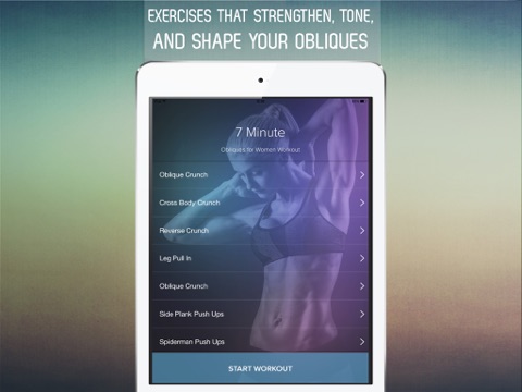 Based on the scientific 7 minute workout template Obliques for Women focuses on bringing the most quick and effective workout program to strengthen, tone, and shape your obliques. We’ll be burning tons of calories and fat along the way as well! In Obliques for Women we’ll be performing a scientifically proven workout template that uses exercises like: