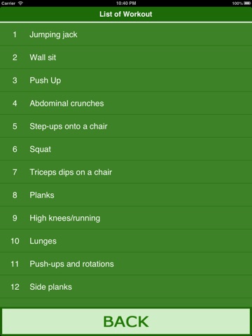 * Perform the workout with countdown timers and prompting for each exercise and breaks.
