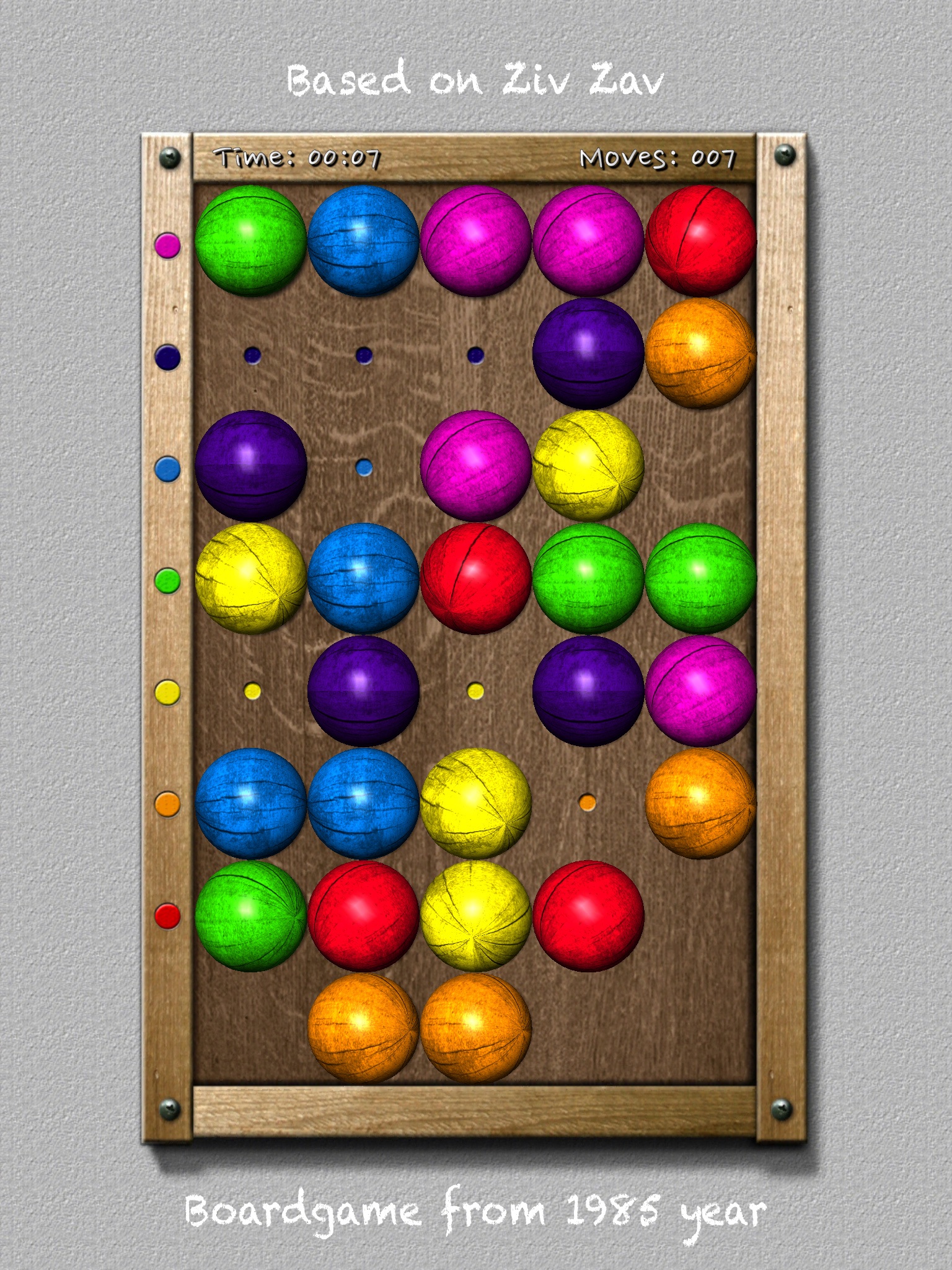 You get an old wooden box with 28 balls in 7 colours which you must place in the correct rows. But be aware balls are randomly placed every time, and when one ball moves in a row, all others also move.