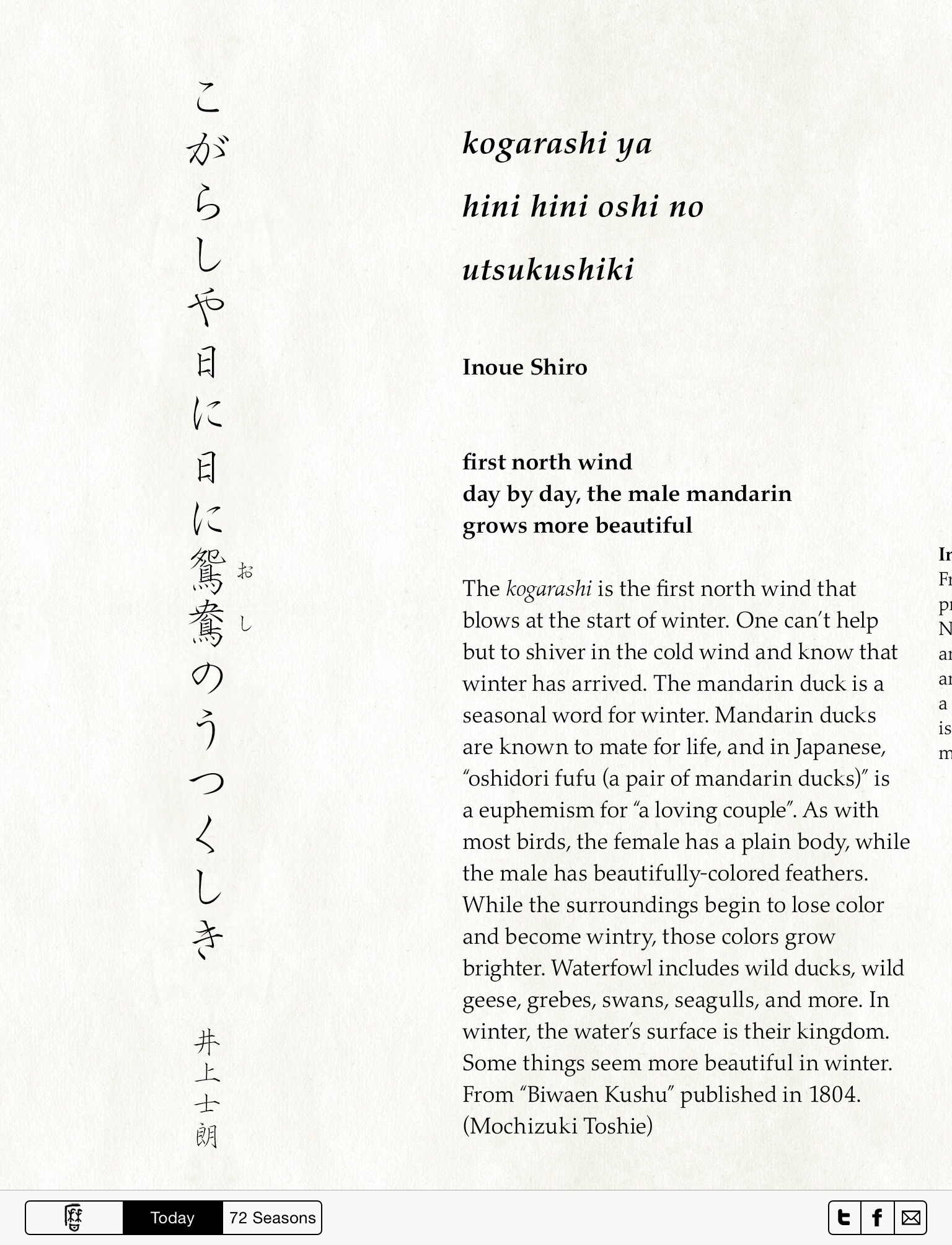 The 72 Seasons app is built on two long scrolls. One lists all 72 seasons across the year, the other is "Todays Season". You can view each with the buttons at the bottom of your screen. Flick the scrolls to move through to the end. The Facebook, Twitter and Email buttons at the bottom of your screen allow you to share the app easily with your friends.