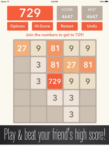 Swipe to move all tiles. When three tiles with the same number touch, they merge into one. Goal of the game is join the tiles to get the 729 tile and reach a high score.