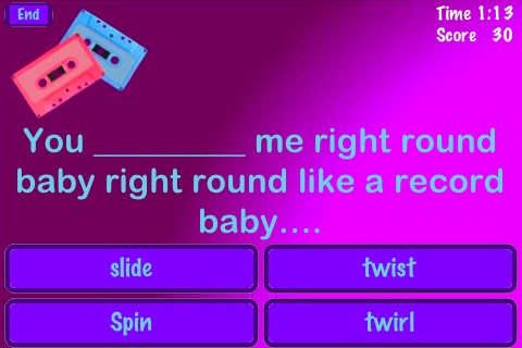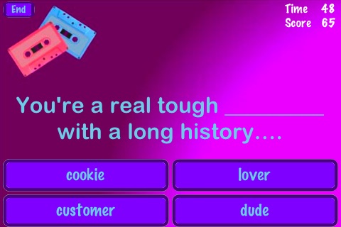 This is a great app! A large variety of lyrics to complete that takes me right back to all those popular 80s songs that I love. Its also fun to get together with friends & challenge one another. It makes me want to break out all those classics again. Great job!!