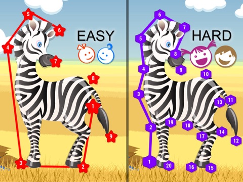 - help features for smaller kids where the outline of the animal is shown, the next dot in sequence starts blinking after a 4 second gap and joining the wrong dot makes it say no with an animation.