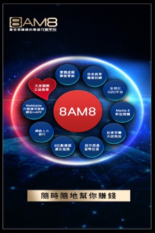 「實體、虛擬聯盟營銷機制」、「信息教育及職業訓練」、「全球化O2O平台」、「Media 8新型態媒體」、「金融眾籌及天使風險投資」、「股市房產貨幣投資」、「8位數傳媒廣告服務」、「網絡人力銀行」、「WeMobile網站及APP行動應用服務」、「天使國際公益慈善」是8AM8發展的目標也是顛覆產業的企圖心,8AM8就像是分裂的細胞以倍數持續擴大成長,期許讓全世界的人都能體驗8AM8為生活帶來的便利以及透過8AM8的自動收入模式替更多的人帶來財富,這是8AM8永續經營的使命。