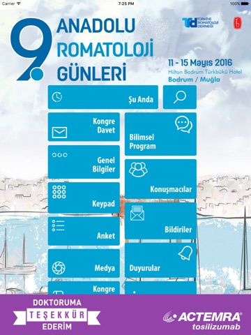 9. Anadolu Romatoloji Günleri Mobil Uygulaması ile kongre öncesinde ve sırasında genel bilgilere, bilimsel program, konuşmacı bilgilerine ve detaylarına ulaşabilir, sunum ve bildiri bölümlerinden bildirilerin kısa detaylarını inceleyebilir izin verilen sunumları pdf olarak görebilirsiniz. Anlık bildirimler, duyurular ve favori bölümü ile oturumlardan, öğle ikramları gibi sosyal etkinliklerden haberdar olabilir, anket sistemimiz ile soruları cevaplayabilir, medya bölümümüzden kongre fotograflarını, videolarını takip edebilirsiniz.