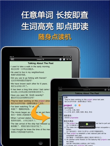 《新英语900句》全文定位点读, 同步高亮显示. 长按任意单词即弹出词典, 同时可将单词加入生词列表. 不需要进度条式的拖拽, 没有查字典的繁琐. 最新支持耳机线控操作, 使用更加轻松便捷.
