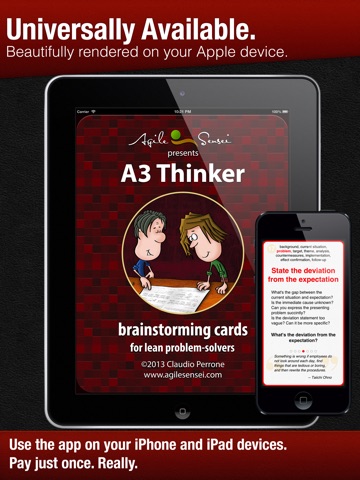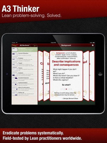 I downloaded this app the day it was released and I was already using it at work the following day. A3 is a Lean technique for understanding situations and problems, finding the deep root causes, identifying and validating counter-measures. A3 Thinking is a method for improving capabilities of organizations on an ongoing basis by finding the right problems to solve and solving them systematically with the help of A3. Ive been using the A3 Thinker app in two different modes. In larger group meetings, when the goal is e.g. to grasp the current condition, identify and state the problem or do the five-whys analysis, I usually only glanced for time to time at my iPad to keep the conversation focused on the particular part of A3 that were working on. Before such meetings, I also flipped through the 65 cards to jog my memory. Card 19 about the problem scope was fresh in my memory during my very first meeting using this app and it saved the remaining half of the conversation. In smaller meetings (up to three people) or when working by myself, I looked at A3 Thinker more closely and reviewed the cards more often to improve the clarity of what was being added to the A3. My work this week included investigating a complex incident with A3 (so far, 22 people from five departments contributed to it) and were basically at a point where counter-measures are suggesting themselves. People are starting to appreciate the power of the A3 technique and the potential of the A3 Thinking method for organizational improvement. Helped by this A3 Thinker app.